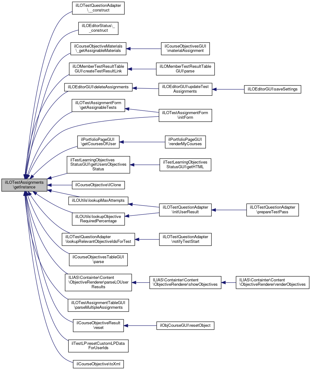 Referenced by ilLOTestQuestionAdapter\__construct(), ilLOEditorStatus\__construct(), ilCourseObjectiveMaterials\_getAssignableMaterials(), ilLOMemberTestResultTableGUI\createTestResultLink(), ilLOEditorGUI\deleteAssignments(), ilLOTestAssignmentForm\getAssignableTests(), ilPortfolioPageGUI\getCoursesOfUser(), ilTestLearningObjectivesStatusGUI\getUsersObjectivesStatus(), ilCourseObjective\ilClone(), ilLOTestAssignmentForm\initForm(), ilLOUtils\lookupMaxAttempts(), ilLOUtils\lookupObjectiveRequiredPercentage(), ilLOTestQuestionAdapter\lookupRelevantObjectiveIdsForTest(), ilCourseObjectivesTableGUI\parse(), ILIAS\Containter\Content\ObjectiveRenderer\parseLOUserResults(), ilLOTestAssignmentTableGUI\parseMultipleAssignments(), ilCourseObjectiveResult\reset(), ilTestLP\resetCustomLPDataForUserIds(), and ilCourseObjective\toXml().