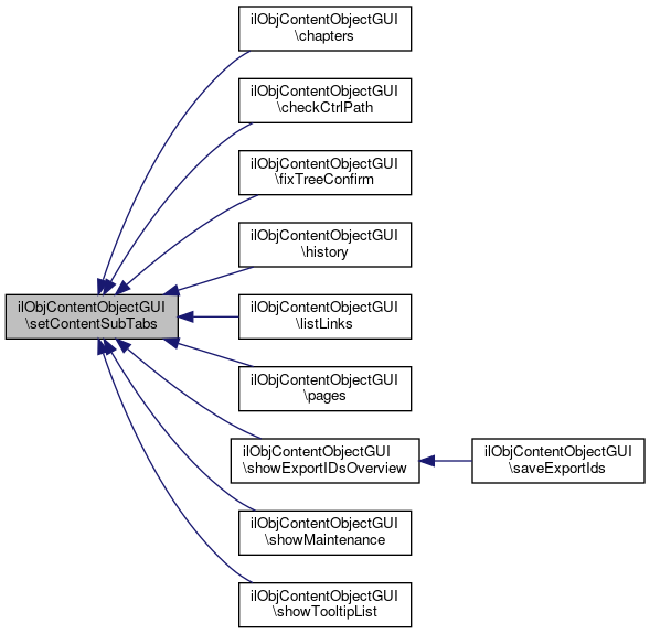 Here is the call graph for this function:| ilObjContentObjectGUI::setContentSubTabs | ( | string | $a_active | ) |