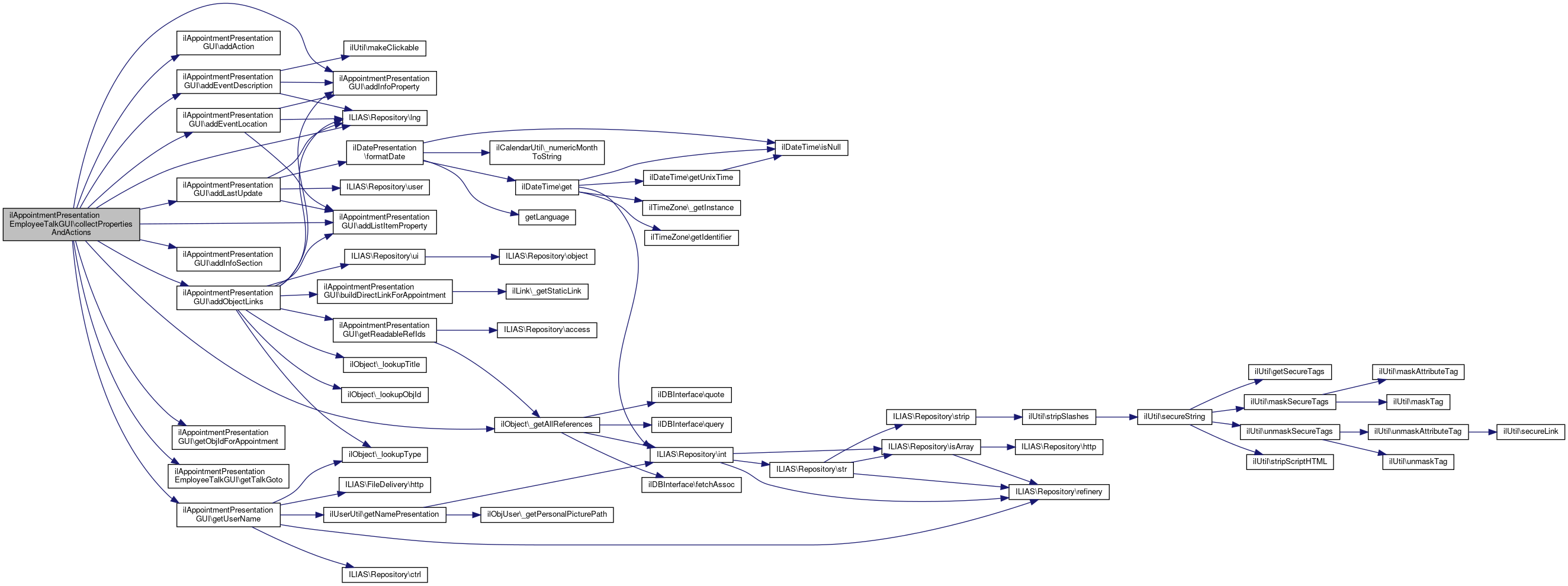 Here is the call graph for this function:| ilAppointmentPresentationEmployeeTalkGUI::collectPropertiesAndActions | ( | ) |