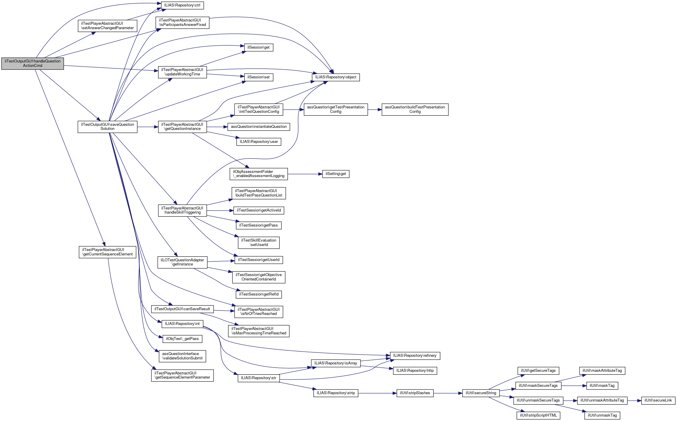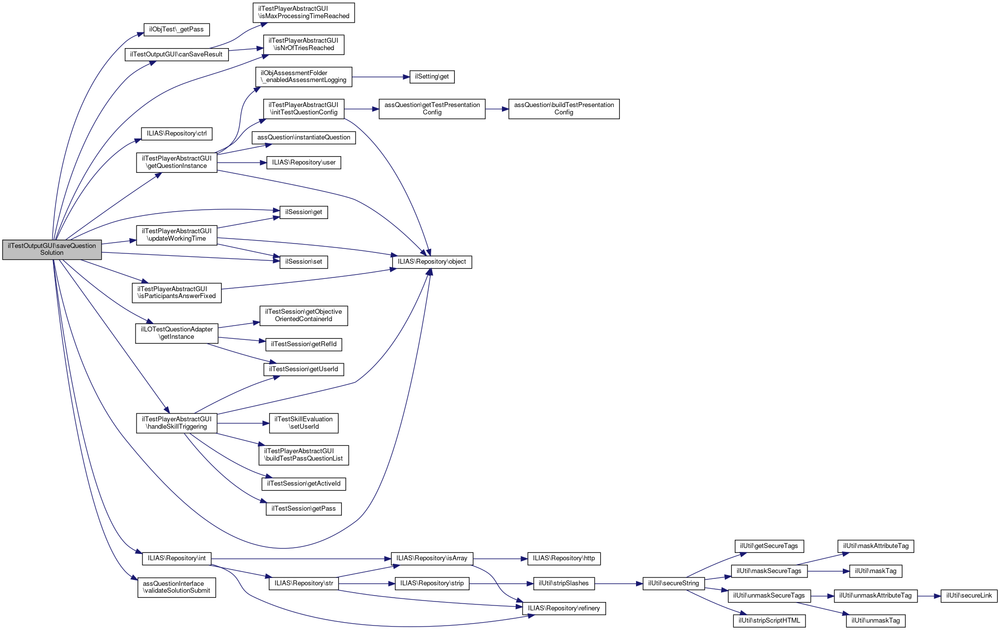 Here is the call graph for this function:| ilTestOutputGUI::saveQuestionSolution | ( | $authorized = true, |