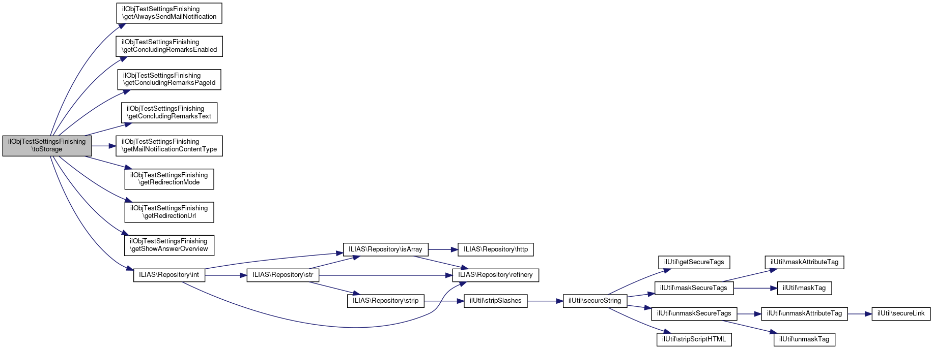 Here is the call graph for this function:| ilObjTestSettingsFinishing::toStorage | ( | ) |