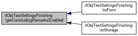 Here is the caller graph for this function:| ilObjTestSettingsFinishing::getConcludingRemarksEnabled | ( | ) |