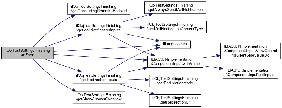 Here is the caller graph for this function:| ilObjTestSettingsFinishing::toForm | ( | \ilLanguage | $lng, |