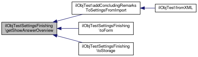 Here is the caller graph for this function:| ilObjTestSettingsFinishing::getShowAnswerOverview | ( | ) |