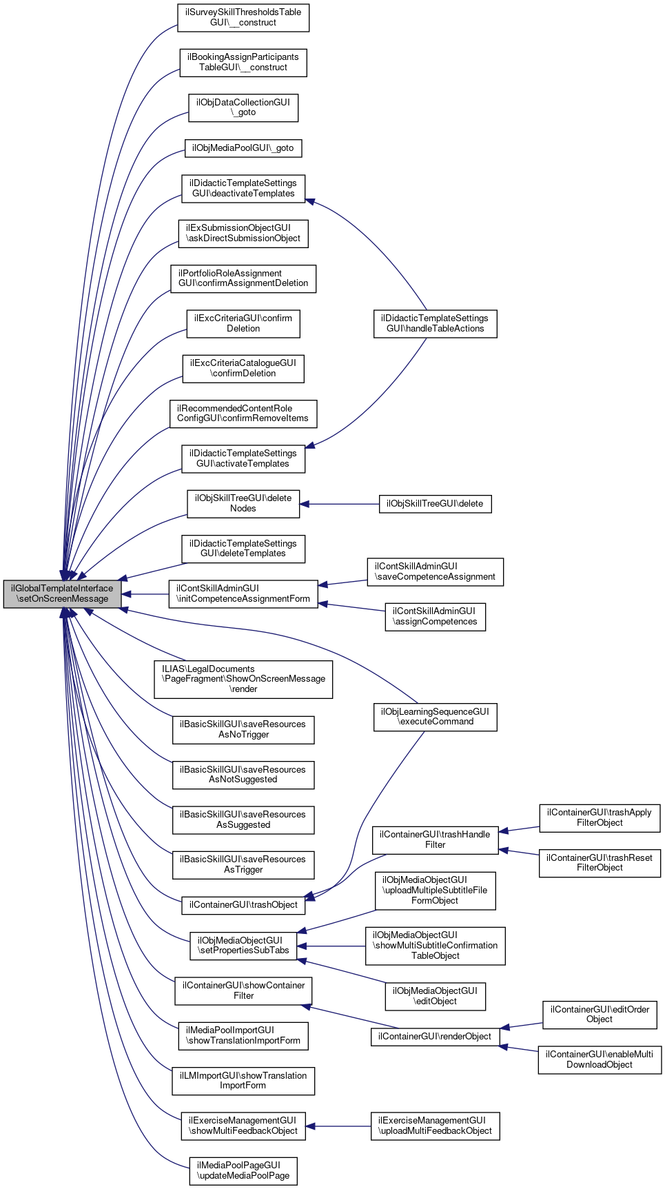 Here is the caller graph for this function:| ilGlobalTemplateInterface::setOnScreenMessage | ( | string | $type, |