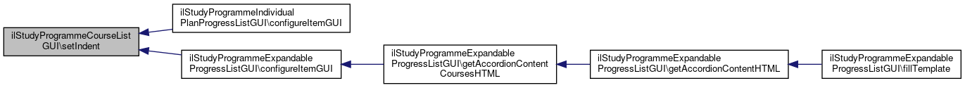 Here is the call graph for this function:| ilStudyProgrammeCourseListGUI::setIndent | ( | int | $a_indent | ) |