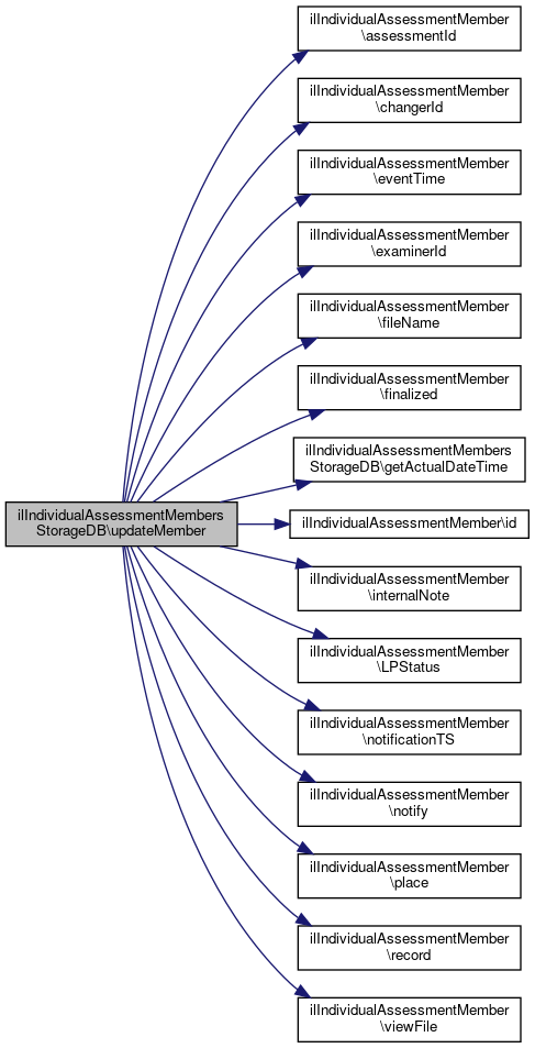 Here is the call graph for this function:| ilIndividualAssessmentMembersStorageDB::updateMember | ( | ilIndividualAssessmentMember | $member | ) |