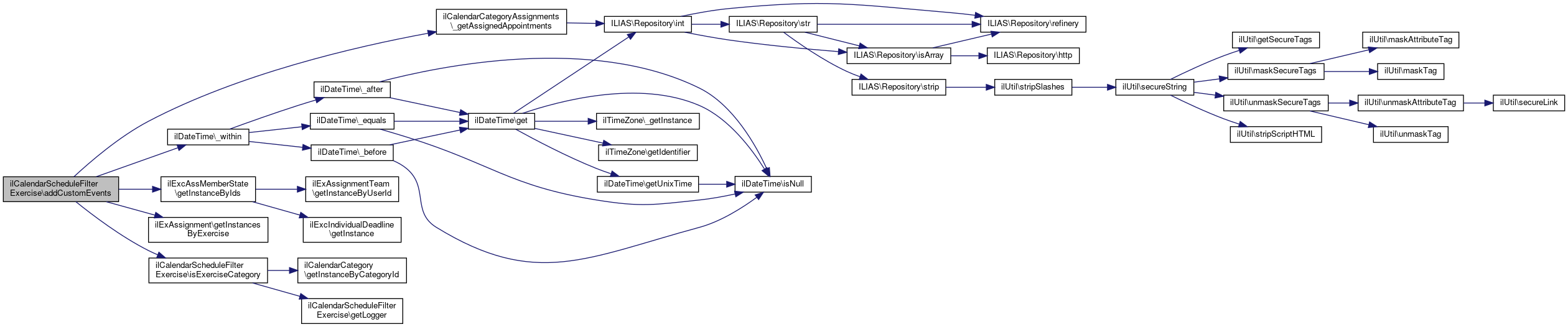 Here is the call graph for this function:| ilCalendarScheduleFilterExercise::addCustomEvents | ( | ilDate | $start, |