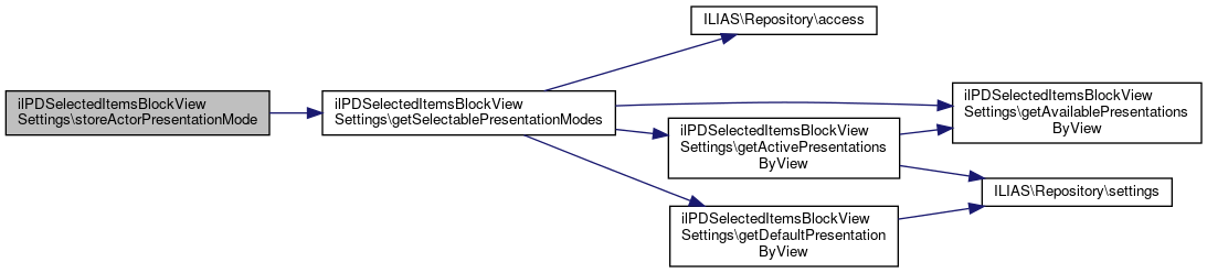 Here is the call graph for this function:| ilPDSelectedItemsBlockViewSettings::storeActorPresentationMode | ( | string | $presentationMode | ) |