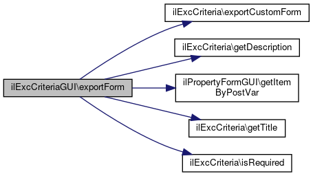 References ilExcCriteria\exportCustomForm(), ilExcCriteria\getDescription(), ilPropertyFormGUI\getItemByPostVar(), ilExcCriteria\getTitle(), and ilExcCriteria\isRequired().