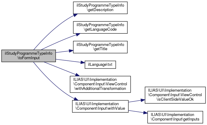 Here is the caller graph for this function:| ilStudyProgrammeTypeInfo::toFormInput | ( | Field\Factory | $input, |