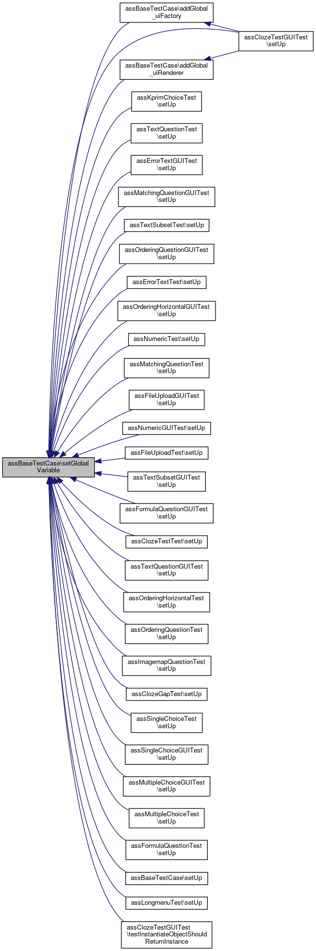 Referenced by addGlobal_uiFactory(), addGlobal_uiRenderer(), assKprimChoiceTest\setUp(), assTextQuestionTest\setUp(), assClozeTestGUITest\setUp(), assErrorTextGUITest\setUp(), assMatchingQuestionGUITest\setUp(), assTextSubsetTest\setUp(), assOrderingQuestionGUITest\setUp(), assErrorTextTest\setUp(), assOrderingHorizontalGUITest\setUp(), assNumericTest\setUp(), assMatchingQuestionTest\setUp(), assFileUploadGUITest\setUp(), assNumericGUITest\setUp(), assFileUploadTest\setUp(), assTextSubsetGUITest\setUp(), assFormulaQuestionGUITest\setUp(), assClozeTestTest\setUp(), assTextQuestionGUITest\setUp(), assOrderingHorizontalTest\setUp(), assOrderingQuestionTest\setUp(), assImagemapQuestionTest\setUp(), assClozeGapTest\setUp(), assSingleChoiceTest\setUp(), assSingleChoiceGUITest\setUp(), assMultipleChoiceGUITest\setUp(), assMultipleChoiceTest\setUp(), assFormulaQuestionTest\setUp(), setUp(), assLongmenuTest\setUp(), and assClozeTestGUITest\testInstantiateObjectShouldReturnInstance().