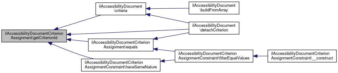 Here is the caller graph for this function:| ilAccessibilityDocumentCriterionAssignment::getCriterionId | ( | ) |