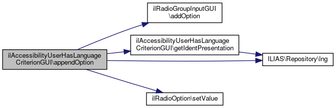 Here is the call graph for this function:| ilAccessibilityUserHasLanguageCriterionGUI::appendOption | ( | ilRadioGroupInputGUI | $option, |