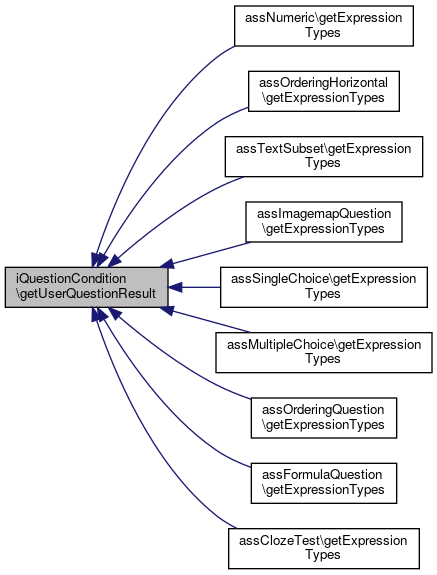 Implemented in assClozeTest, assMatchingQuestion, assFormulaQuestion, assOrderingQuestion, assMultipleChoice, assSingleChoice, assErrorText, assImagemapQuestion, assTextSubset, assOrderingHorizontal, and assNumeric.