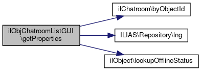 Here is the call graph for this function:| ilObjChatroomListGUI::getProperties | ( | ) |
