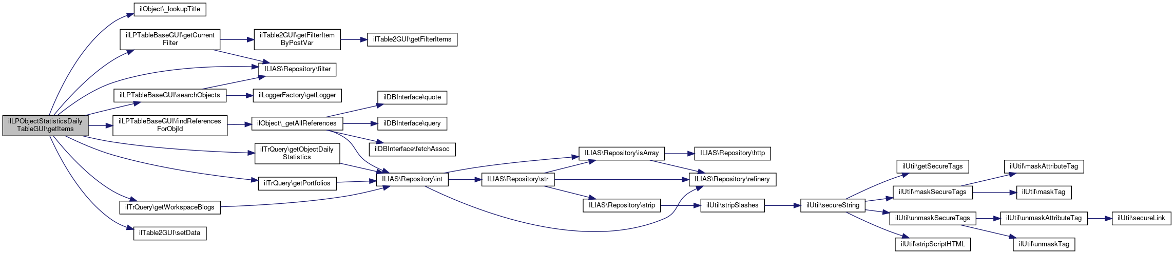 Here is the call graph for this function:| ilLPObjectStatisticsDailyTableGUI::getItems | ( | ) |