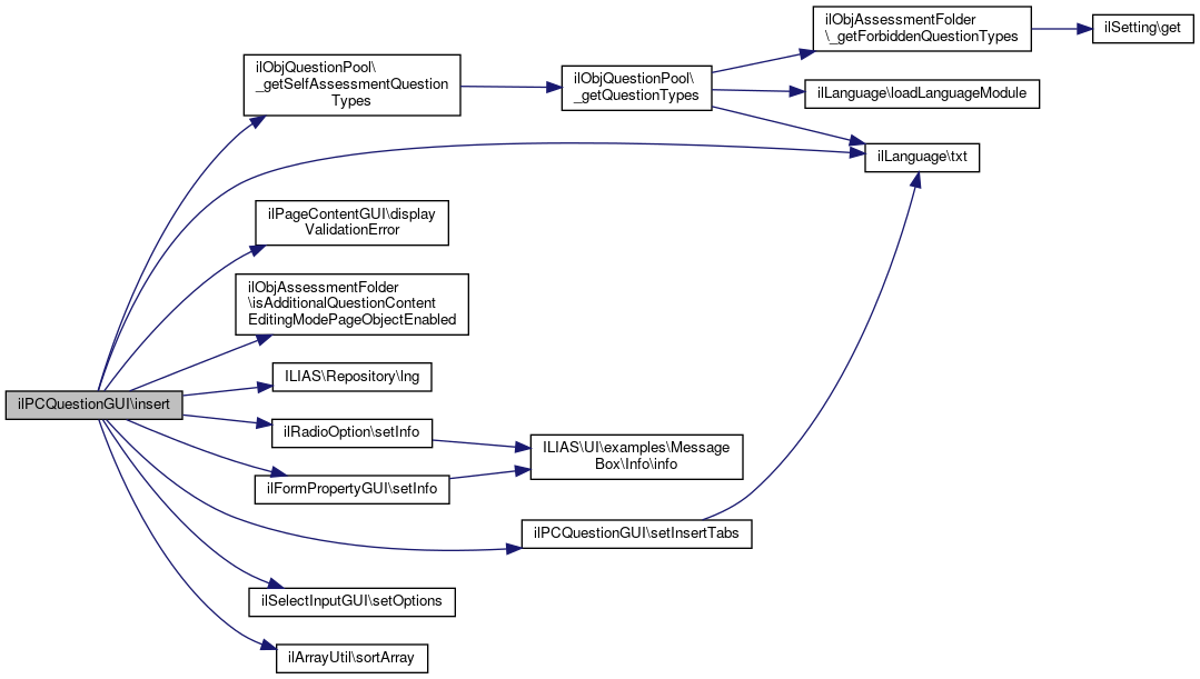 References ilPageContentGUI\$ctrl, ilPageContentGUI\$lng, ilObjQuestionPool\_getSelfAssessmentQuestionTypes(), assQuestion\ADDITIONAL_CONTENT_EDITING_MODE_IPE, assQuestion\ADDITIONAL_CONTENT_EDITING_MODE_RTE, ilPageContentGUI\displayValidationError(), ilObjAssessmentFolder\isAdditionalQuestionContentEditingModePageObjectEnabled(), ILIAS\Repository\lng(), ilRadioOption\setInfo(), ilFormPropertyGUI\setInfo(), setInsertTabs(), ilSelectInputGUI\setOptions(), ilArrayUtil\sortArray(), and ilLanguage\txt().