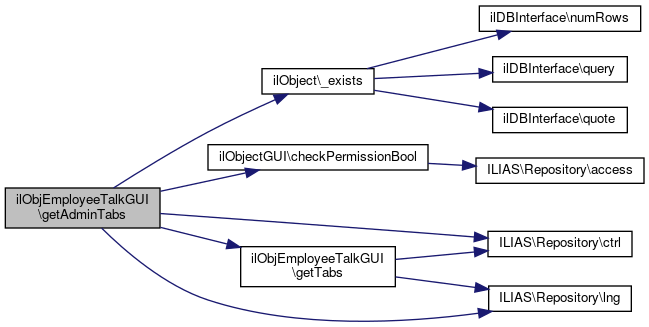 Here is the call graph for this function:| ilObjEmployeeTalkGUI::getAdminTabs | ( | ) |