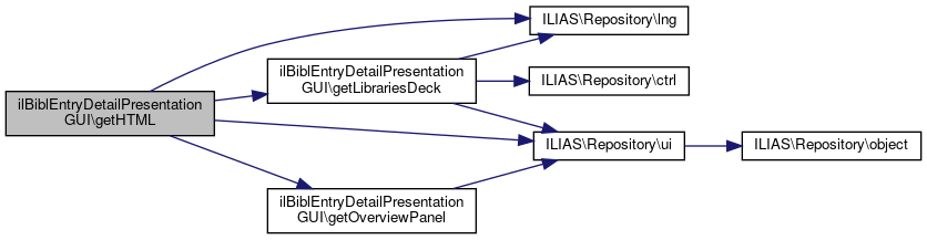 Here is the call graph for this function:| ilBiblEntryDetailPresentationGUI::getHTML | ( | ) |