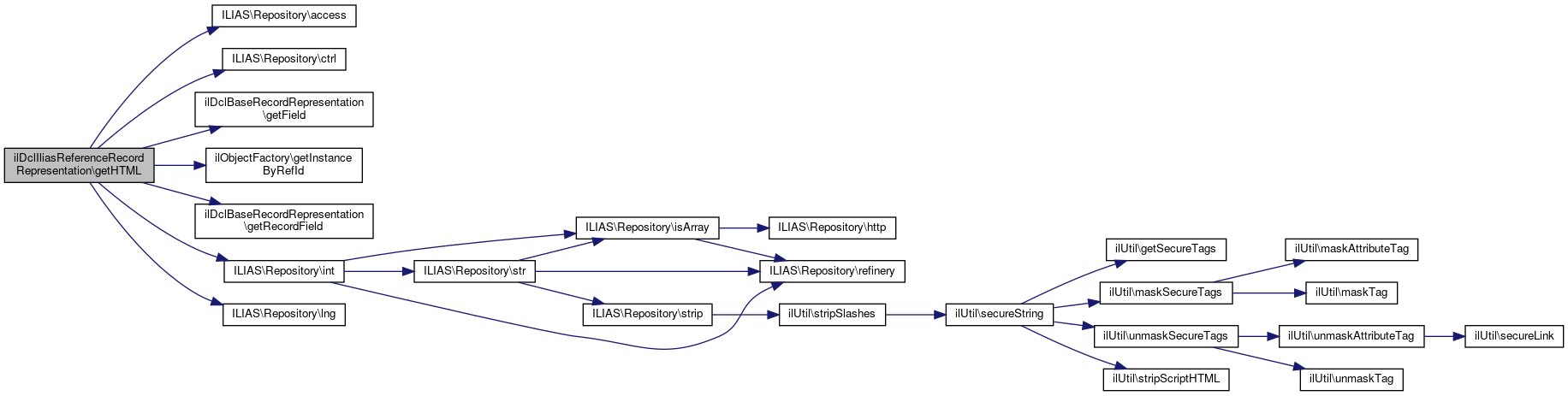 Here is the call graph for this function:| ilDclIliasReferenceRecordRepresentation::getHTML | ( | bool | $link = true,  |