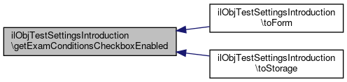 Here is the call graph for this function:| ilObjTestSettingsIntroduction::getExamConditionsCheckboxEnabled | ( | ) |