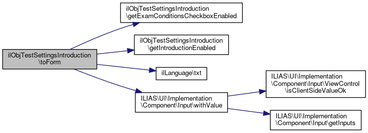 Here is the caller graph for this function:| ilObjTestSettingsIntroduction::toForm | ( | \ilLanguage | $lng, |