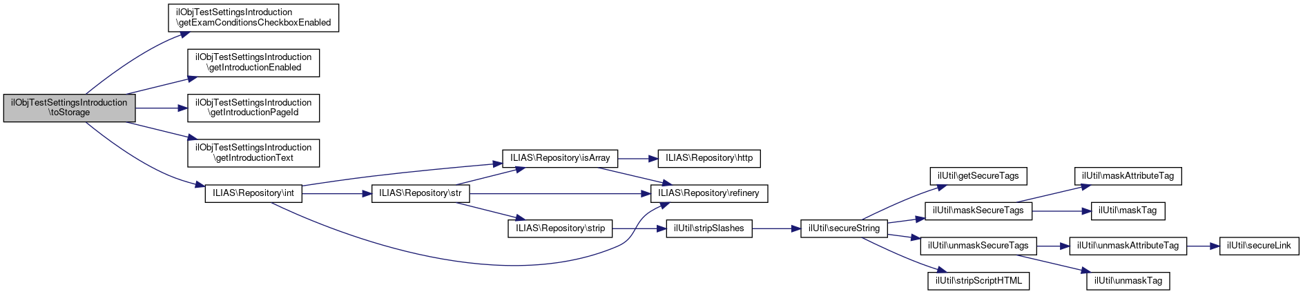 Here is the call graph for this function:| ilObjTestSettingsIntroduction::toStorage | ( | ) |