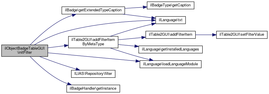References ilTable2GUI\$id, ilTableGUI\$lng, ilTableGUI\$title, ilTable2GUI\addFilterItemByMetaType(), ILIAS\Repository\filter(), ilBadge\getExtendedTypeCaption(), ilBadgeHandler\getInstance(), ilLanguage\loadLanguageModule(), and ilLanguage\txt().