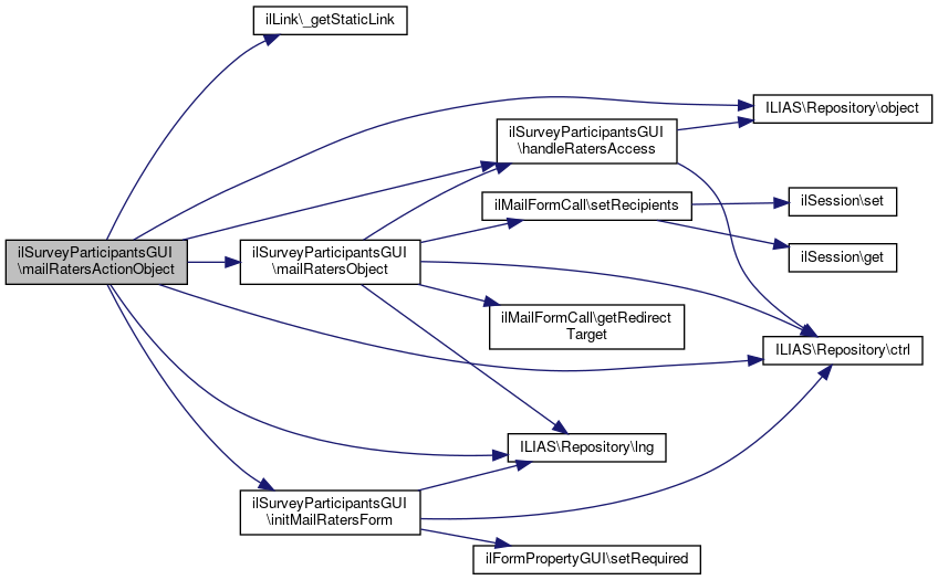 Here is the call graph for this function:| ilSurveyParticipantsGUI::mailRatersActionObject | ( | ) |