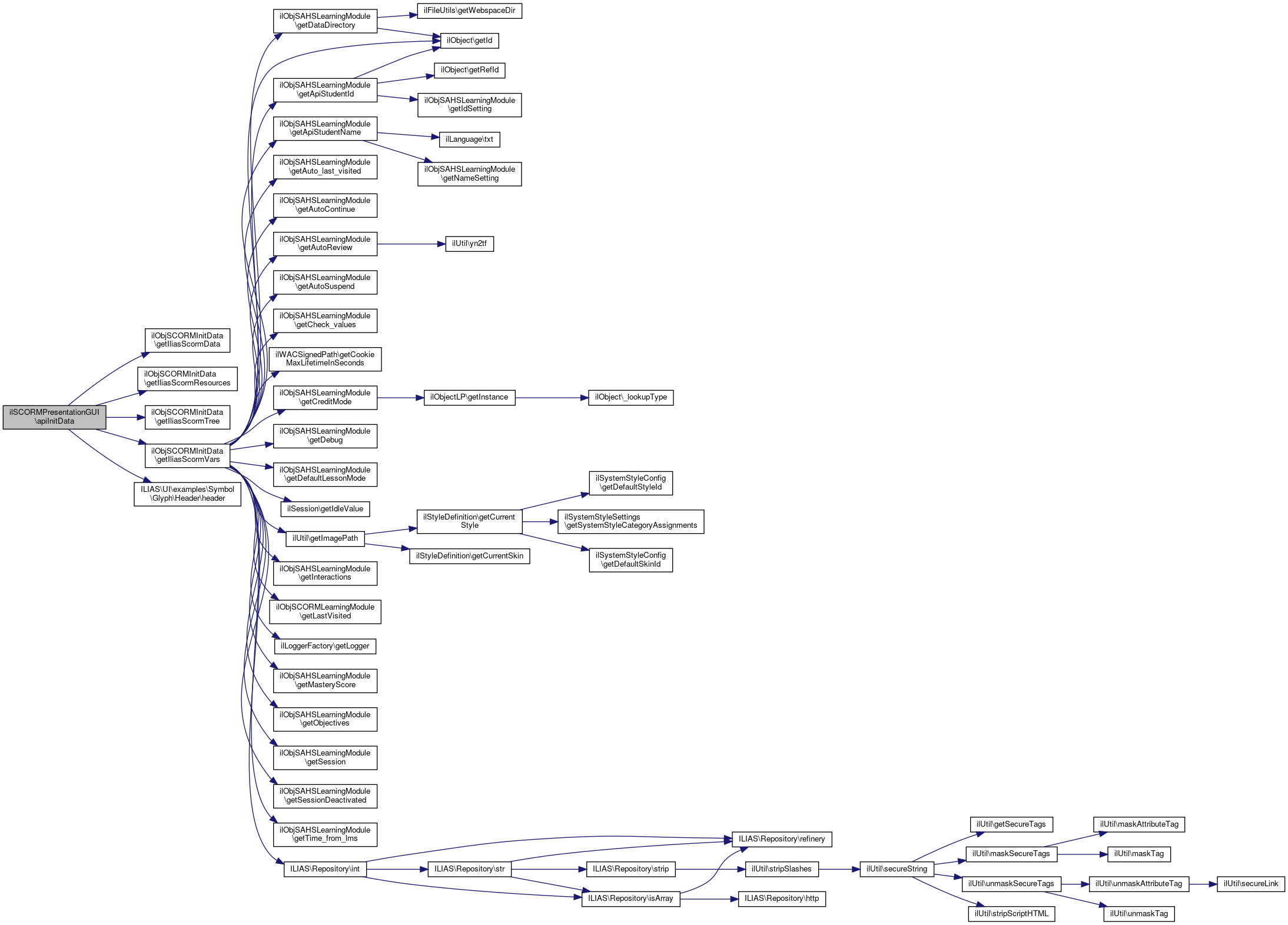 Here is the call graph for this function:| ilSCORMPresentationGUI::apiInitData | ( | ) |