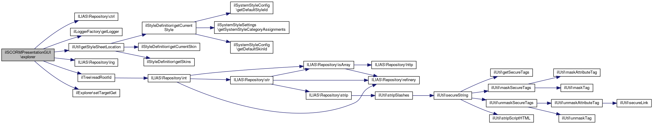 Here is the call graph for this function:| ilSCORMPresentationGUI::explorer | ( | string | $a_target = "sahs_content" | ) |