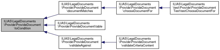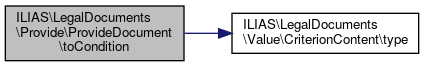 Here is the call graph for this function:| ILIAS\LegalDocuments\Provide\ProvideDocument::toCondition | ( | CriterionContent | $content | ) |