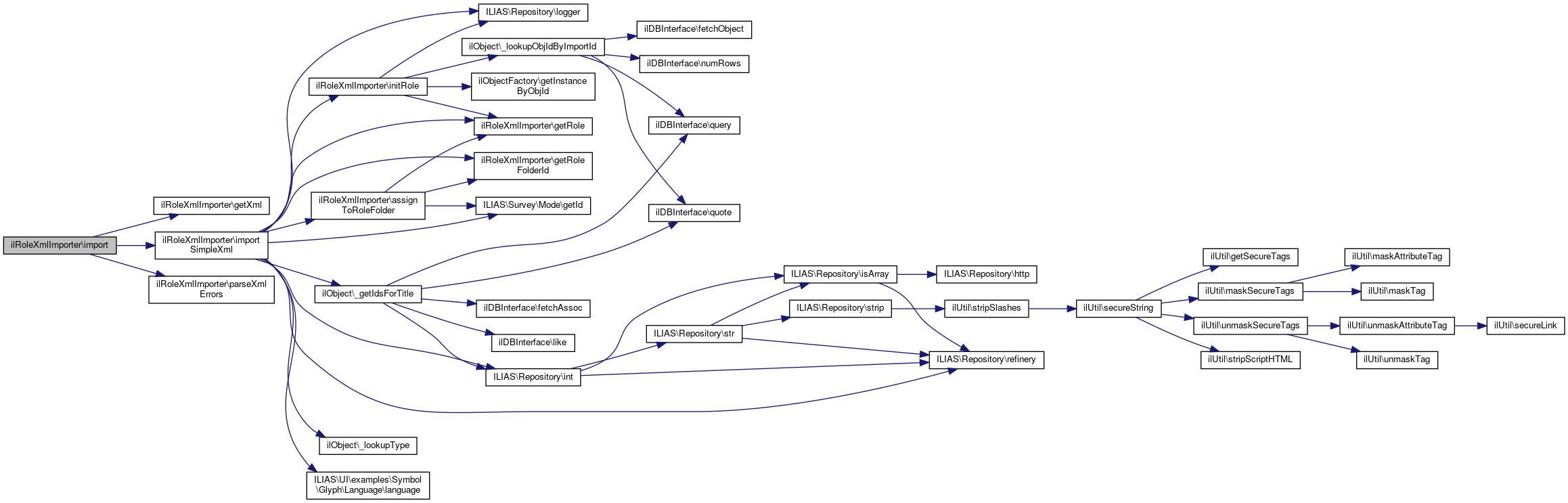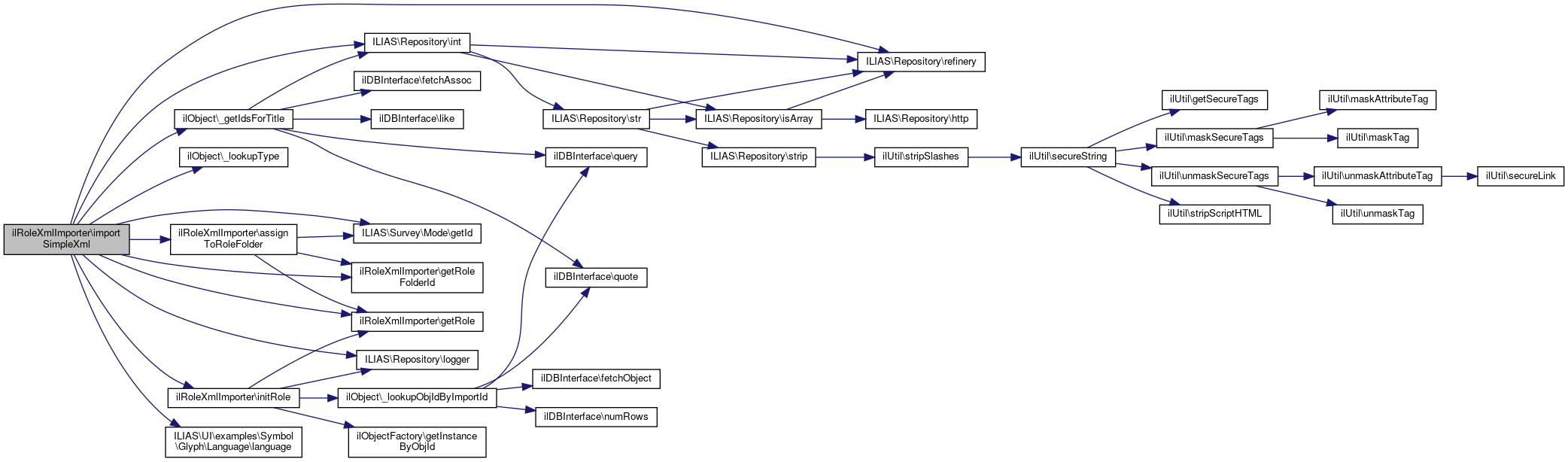 Here is the call graph for this function:| ilRoleXmlImporter::importSimpleXml | ( | SimpleXMLElement | $role | ) |
