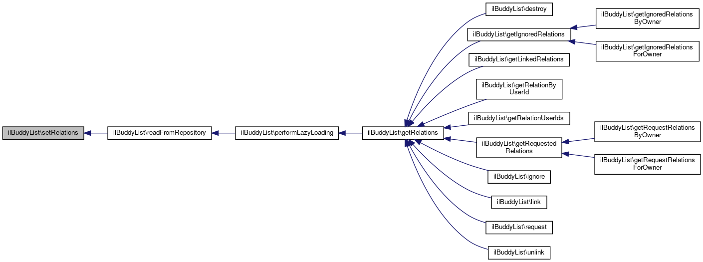 Here is the caller graph for this function:| ilBuddyList::setRelations | ( | ilBuddySystemRelationCollection | $relations | ) |