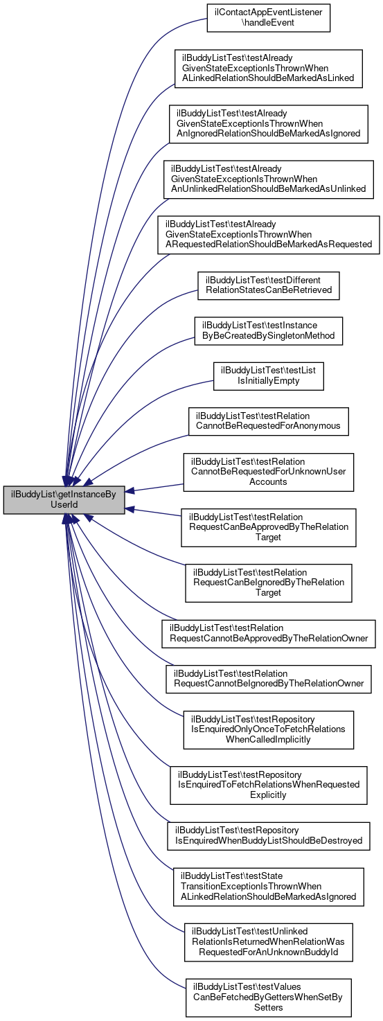 Referenced by ilContactAppEventListener\handleEvent(), ilBuddyListTest\testAlreadyGivenStateExceptionIsThrownWhenALinkedRelationShouldBeMarkedAsLinked(), ilBuddyListTest\testAlreadyGivenStateExceptionIsThrownWhenAnIgnoredRelationShouldBeMarkedAsIgnored(), ilBuddyListTest\testAlreadyGivenStateExceptionIsThrownWhenAnUnlinkedRelationShouldBeMarkedAsUnlinked(), ilBuddyListTest\testAlreadyGivenStateExceptionIsThrownWhenARequestedRelationShouldBeMarkedAsRequested(), ilBuddyListTest\testDifferentRelationStatesCanBeRetrieved(), ilBuddyListTest\testInstanceByBeCreatedBySingletonMethod(), ilBuddyListTest\testListIsInitiallyEmpty(), ilBuddyListTest\testRelationCannotBeRequestedForAnonymous(), ilBuddyListTest\testRelationCannotBeRequestedForUnknownUserAccounts(), ilBuddyListTest\testRelationRequestCanBeApprovedByTheRelationTarget(), ilBuddyListTest\testRelationRequestCanBeIgnoredByTheRelationTarget(), ilBuddyListTest\testRelationRequestCannotBeApprovedByTheRelationOwner(), ilBuddyListTest\testRelationRequestCannotBeIgnoredByTheRelationOwner(), ilBuddyListTest\testRepositoryIsEnquiredOnlyOnceToFetchRelationsWhenCalledImplicitly(), ilBuddyListTest\testRepositoryIsEnquiredToFetchRelationsWhenRequestedExplicitly(), ilBuddyListTest\testRepositoryIsEnquiredWhenBuddyListShouldBeDestroyed(), ilBuddyListTest\testStateTransitionExceptionIsThrownWhenALinkedRelationShouldBeMarkedAsIgnored(), ilBuddyListTest\testUnlinkedRelationIsReturnedWhenRelationWasRequestedForAnUnknownBuddyId(), and ilBuddyListTest\testValuesCanBeFetchedByGettersWhenSetBySetters().