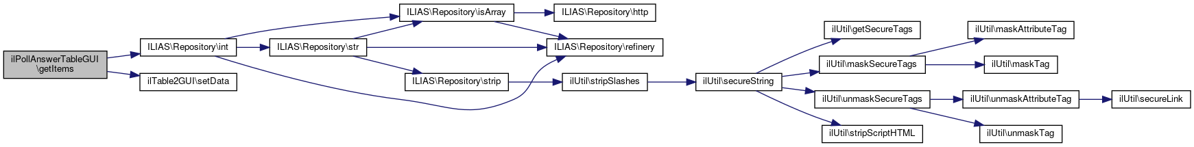 Here is the call graph for this function:| ilPollAnswerTableGUI::getItems | ( | ) |