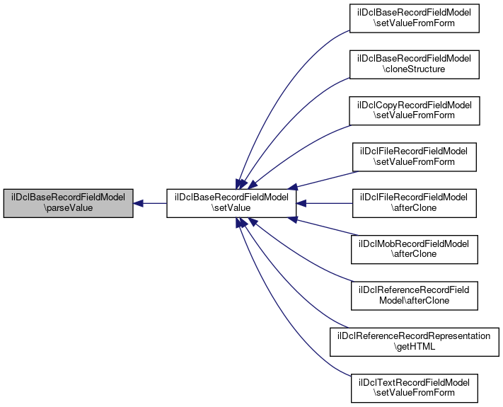 Referenced by ilDclTextRecordFieldModel\addHiddenItemsToConfirmation(), addHiddenItemsToConfirmation(), ilDclReferenceRecordFieldModel\afterClone(), ilDclCopyRecordFieldModel\deserializeData(), ilDclTextRecordFieldModel\deserializeData(), deserializeData(), doUpdate(), ilDclTextRecordFieldModel\fillExcelExport(), ilDclReferenceRecordFieldModel\getExportValue(), ilDclIliasReferenceRecordFieldModel\getExportValue(), ilDclTextRecordFieldModel\getExportValue(), ilDclTextRecordFieldModel\getPlainText(), ilDclReferenceRecordFieldModel\getReferenceFromValue(), ilDclSelectionRecordFieldModel\getValue(), getValue(), ilDclDateRecordFieldModel\getValueFromExcel(), ilDclReferenceRecordFieldModel\getValueFromExcel(), ilDclTextRecordFieldModel\getValueFromExcel(), ilDclSelectionRecordFieldModel\getValueFromString(), loadValue(), ilDclBooleanRecordFieldModel\parseExportValue(), ilDclSelectionRecordFieldModel\parseExportValue(), ilDclDateRecordFieldModel\parseExportValue(), ilDclMobRecordFieldModel\parseExportValue(), ilDclFileRecordFieldModel\parseExportValue(), parseExportValue(), ilDclDateRecordFieldModel\parseSortingValue(), ilDclTextRecordFieldModel\parseSortingValue(), ilDclMobRecordFieldModel\parseSortingValue(), ilDclFileRecordFieldModel\parseSortingValue(), parseSortingValue(), ilDclMobRecordFieldModel\parseValue(), ilDclNumberRecordFieldModel\parseValue(), ilDclBooleanRecordFieldModel\parseValue(), ilDclDateRecordFieldModel\parseValue(), ilDclFileRecordFieldModel\parseValue(), parseValue(), serializeData(), ilDclFormulaRecordFieldModel\setValue(), setValue(), ilDclTextRecordFieldModel\setValueFromForm(), ilDclCopyRecordFieldModel\setValueFromForm(), and setValueFromForm().