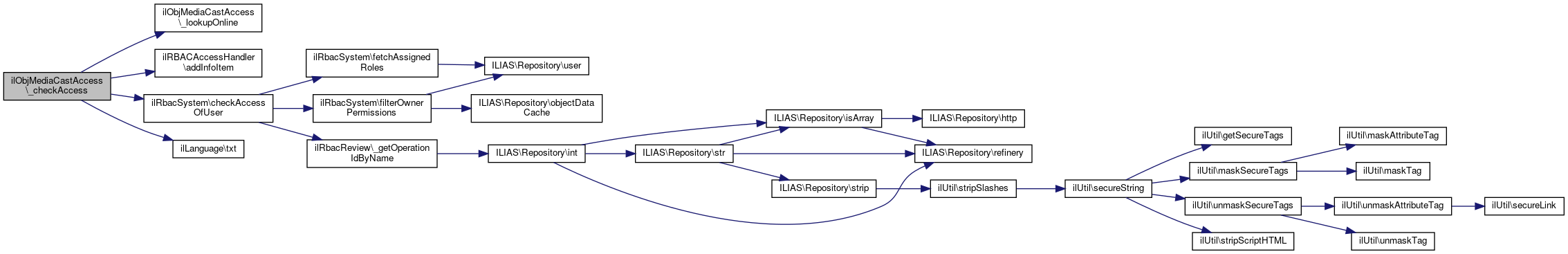 Here is the call graph for this function:| ilObjMediaCastAccess::_checkAccess | ( | string | $cmd, |