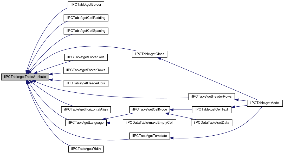 Here is the call graph for this function:| ilPCTable::getTableAttribute | ( | string | $a_attr | ) |