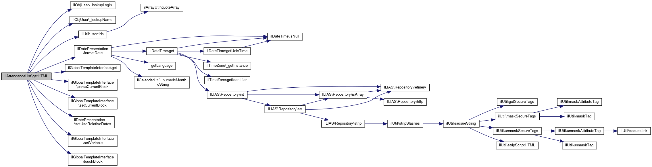 Here is the call graph for this function:| ilAttendanceList::getHTML | ( | ) |