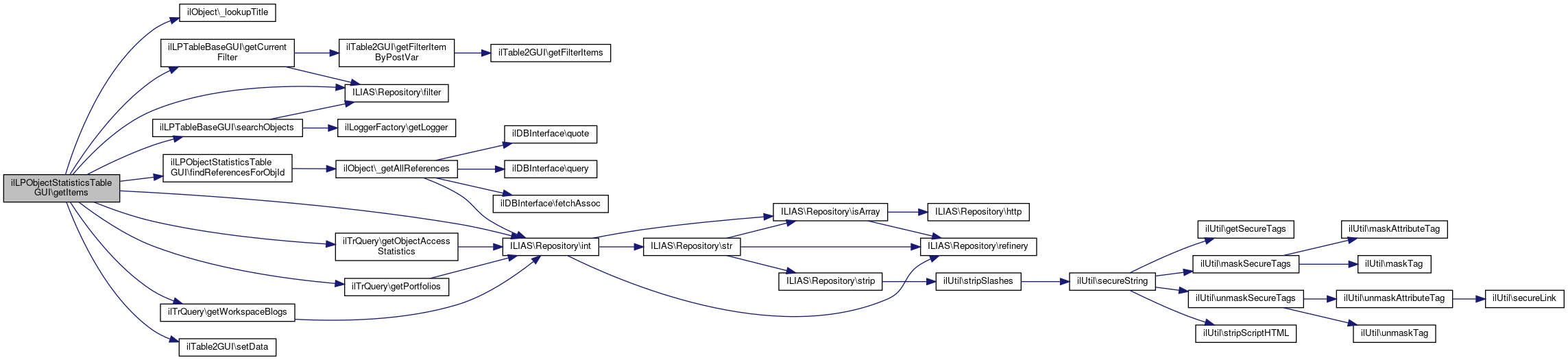 Here is the call graph for this function:| ilLPObjectStatisticsTableGUI::getItems | ( | ) |