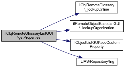 Here is the call graph for this function:| ilObjRemoteGlossaryListGUI::getProperties | ( | ) |