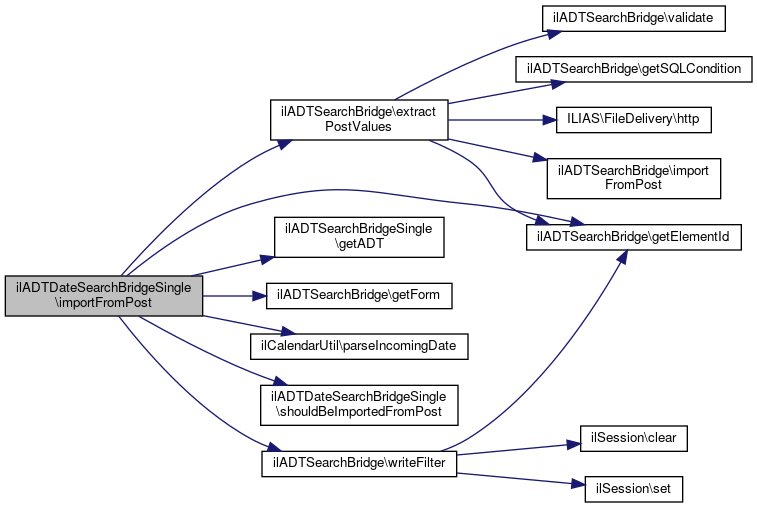 Here is the call graph for this function:| ilADTDateSearchBridgeSingle::importFromPost | ( | array | $a_post = null | ) |