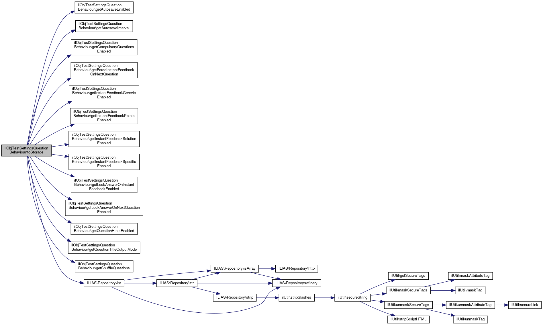Here is the call graph for this function:| ilObjTestSettingsQuestionBehaviour::toStorage | ( | ) |