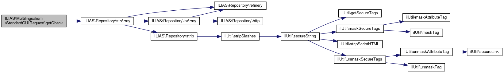 Here is the call graph for this function:| ILIAS\Multilingualism\StandardGUIRequest::getCheck | ( | ) |