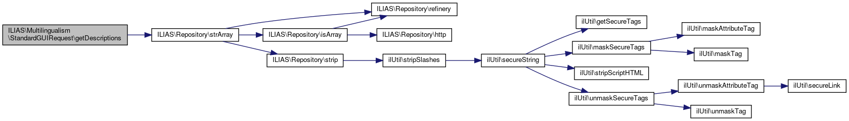 Here is the call graph for this function:| ILIAS\Multilingualism\StandardGUIRequest::getDescriptions | ( | ) |