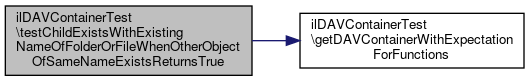 Here is the call graph for this function:| ilDAVContainerTest::testChildExistsWithExistingNameOfFolderOrFileWhenOtherObjectOfSameNameExistsReturnsTrue | ( | ) |