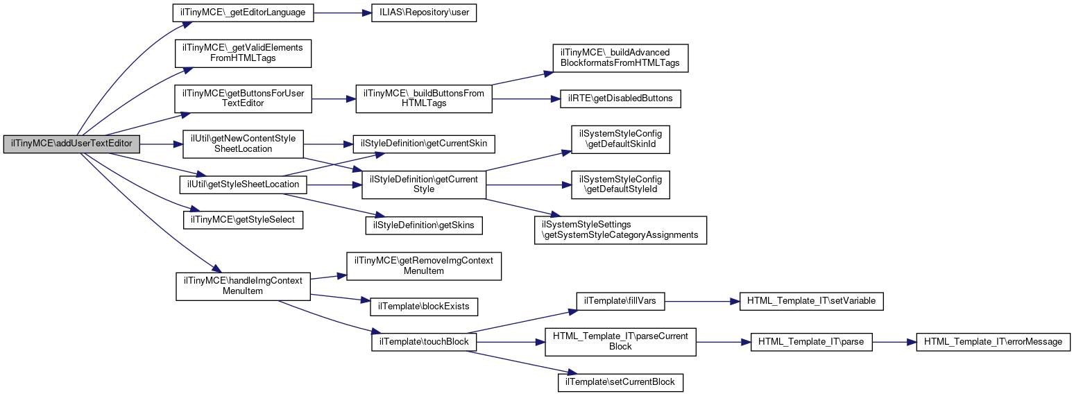 Here is the call graph for this function:| ilTinyMCE::addUserTextEditor | ( | string | $editor_selector | ) |