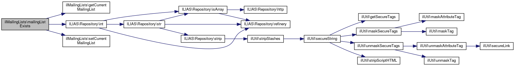 Here is the call graph for this function:| ilMailingLists::mailingListExists | ( | string | $a_list_name | ) |